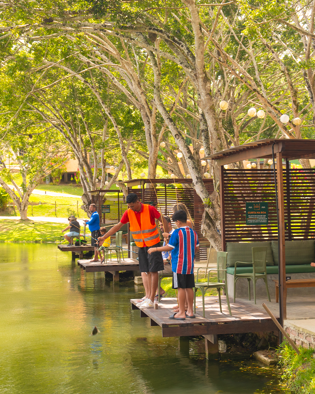 Para os amantes da pesca, oferecemos um lounge exclusivo para relaxar e aproveitar a tranquilidade da natureza, com capacidade para até 10 pessoas. O aluguel de equipamentos não está incluso, e serviços de alimentação e bebidas são cobrados à parte. Aproveite a liberdade para personalizar sua experiência e curtir a paz do ambiente.